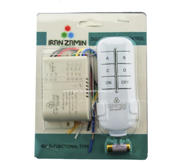 ریموت کنترل 4 کانال با خروجی 220 ولت مناسب برای خاموش و روشن نمودن انواع وسایل برقی مانند لامپ و لوستر است . این محصول دارای یک گیرنده است که تا 1000 وات برای وسایل خانگی الکتریکی و تا 200 وات برای لامپ های ال ای دی و کم مصرف قابل استفاده می باشد . طریقه نصب محصول مطابق نقشه ای که بر روی گیرنده ها قرار دارد می باشد .جهت راه اندازی و اتصال آن به سیستم روشنایی می بایست سیم های ورودی قرمز و مشکی به برق شهری متصل نموده و سیم های رنگی را به لامپها متصل نمایید و در نهایت سیم مشکی را به سر مشترک لامپ ها اتصال دهید.